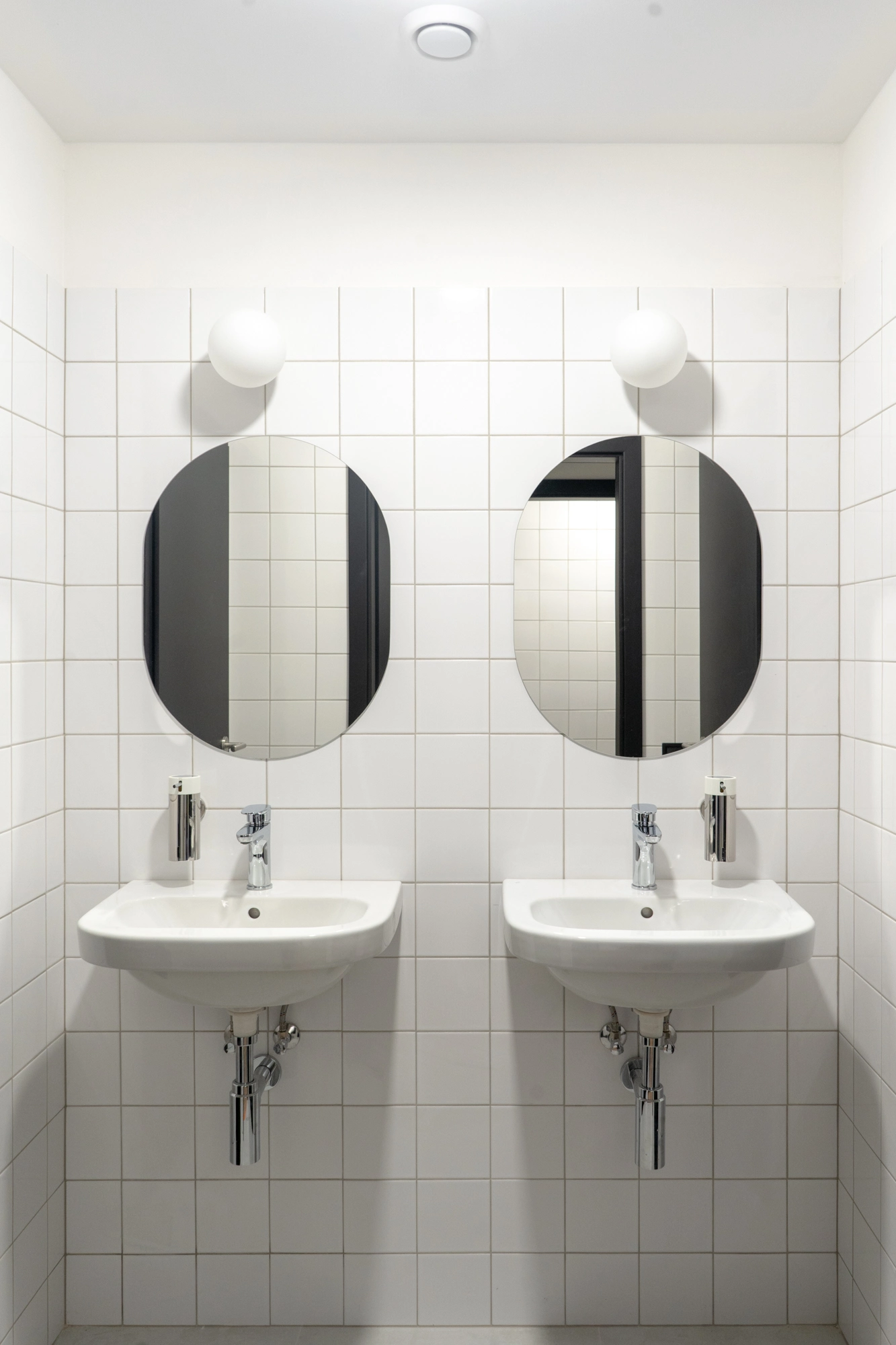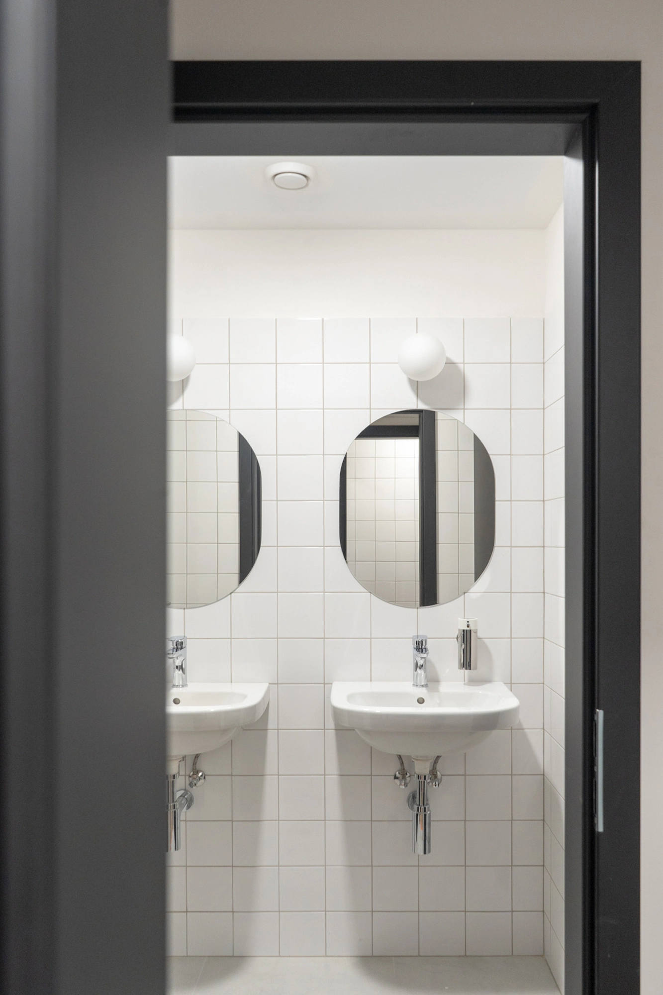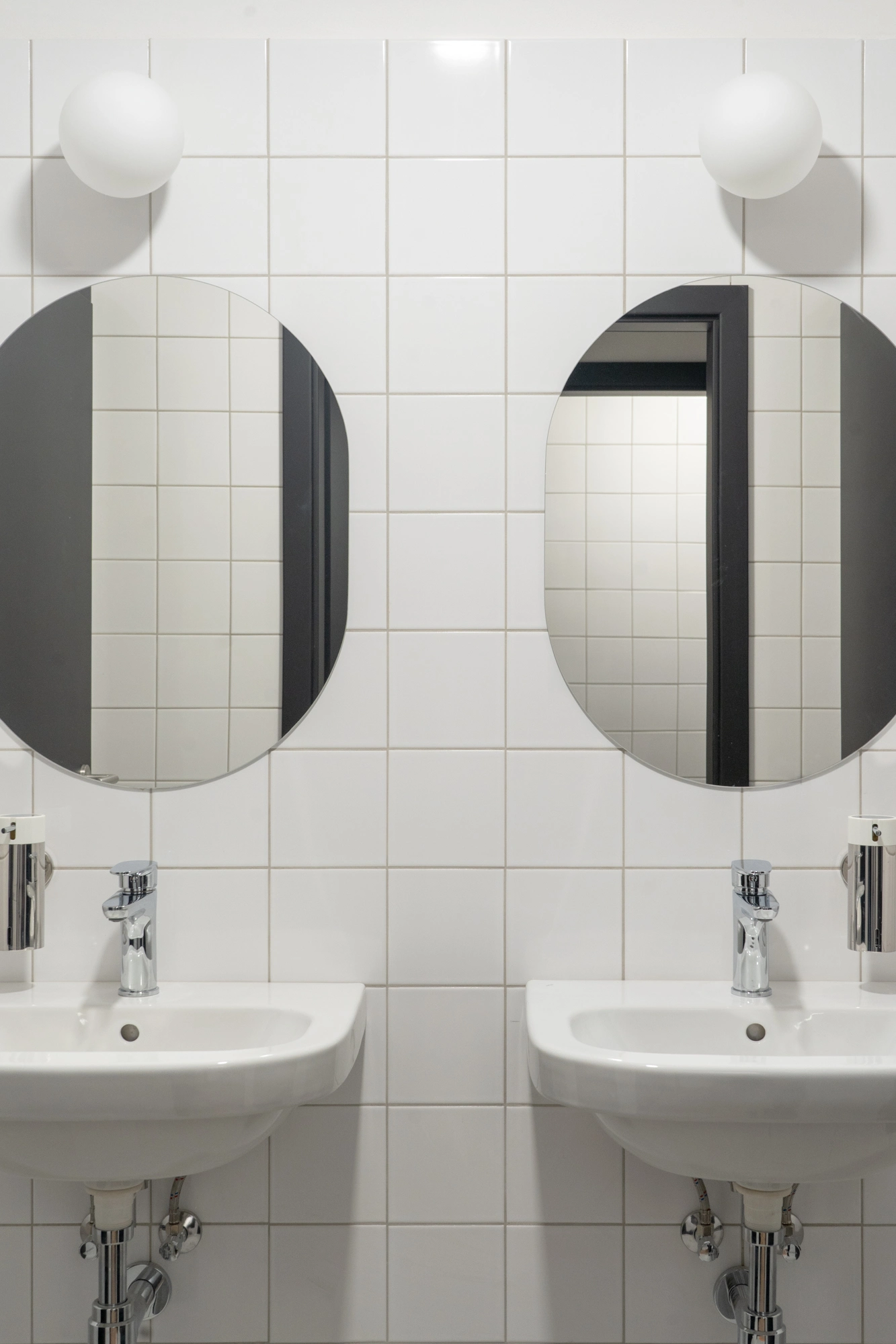hraje kombinací čtvercových obkladů s oblými tvary zařizovacích